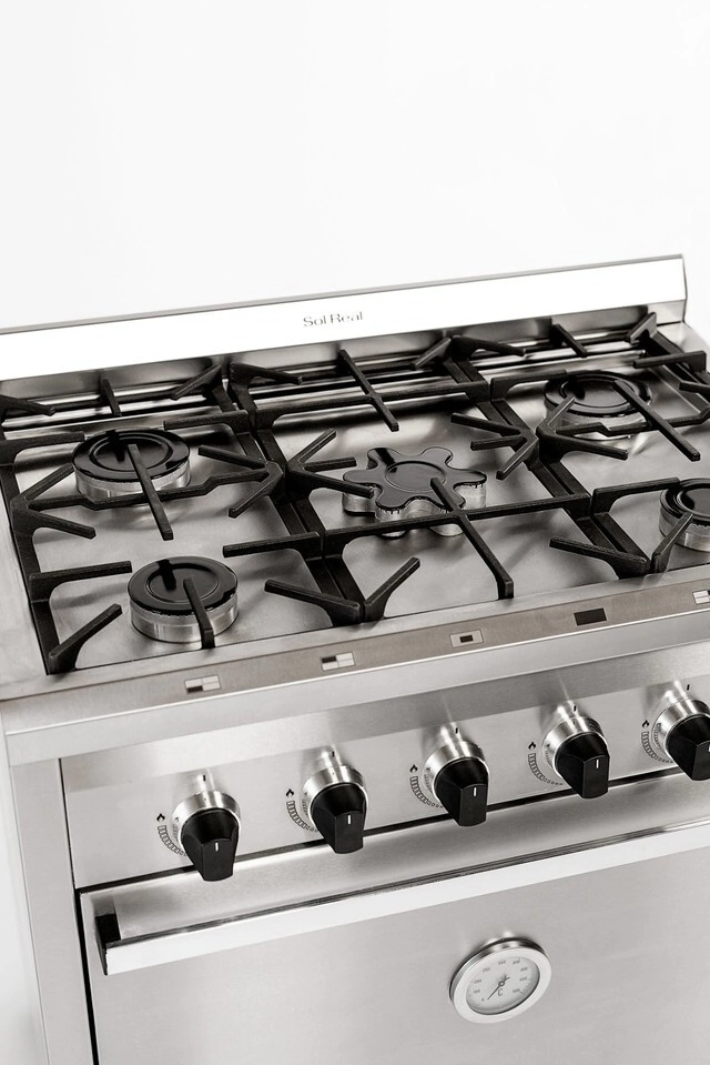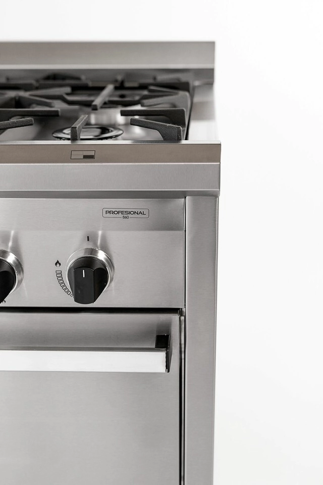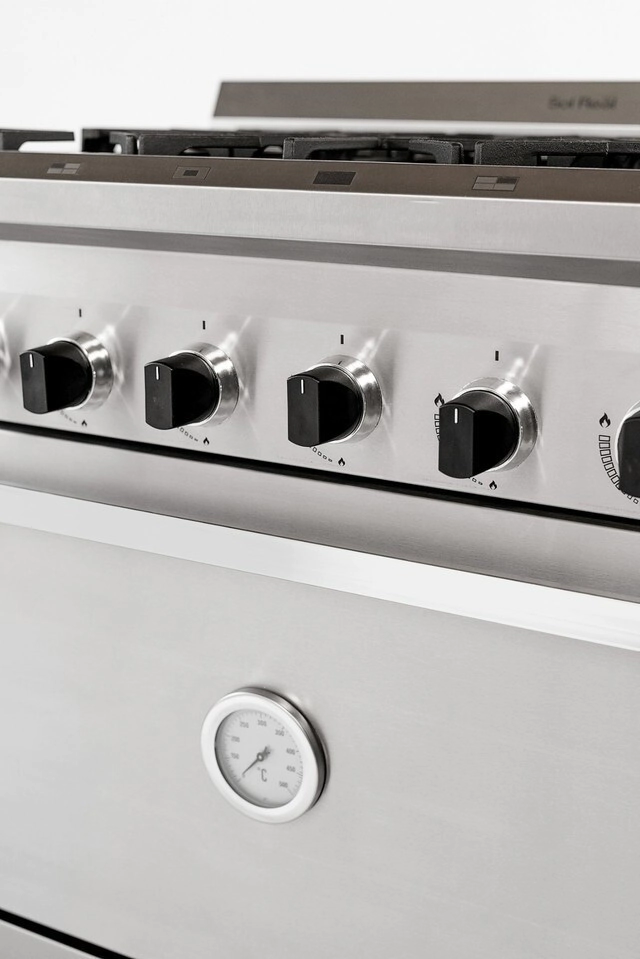 • Puerta de acero inox. Esmerilado en exterior (según modelo) e interior enlozado con manija metálica (pintura epóxi humo gris liso), bisagras embutidas y pirómetro analógico.