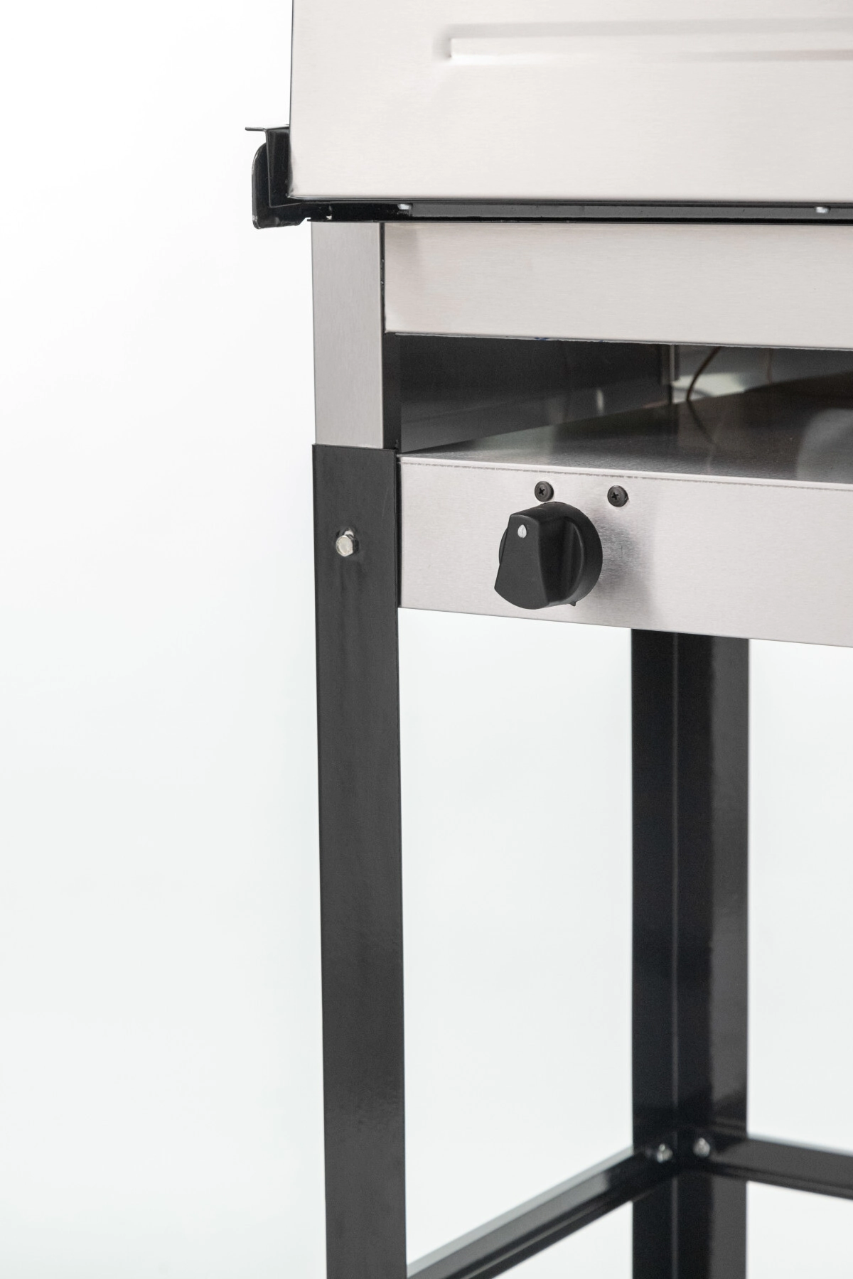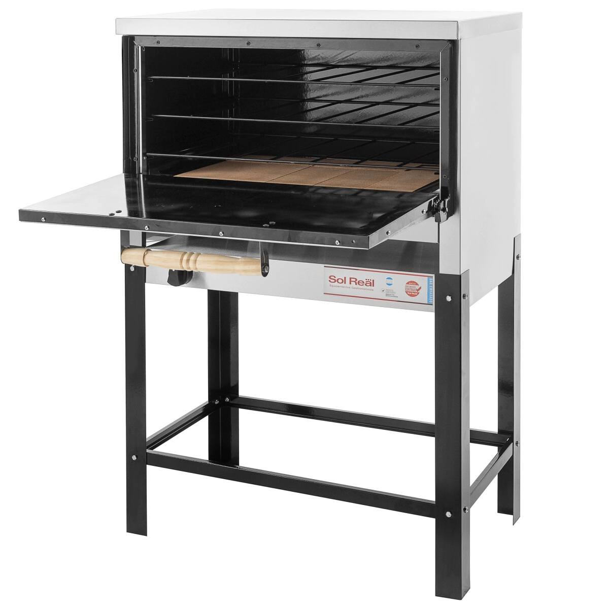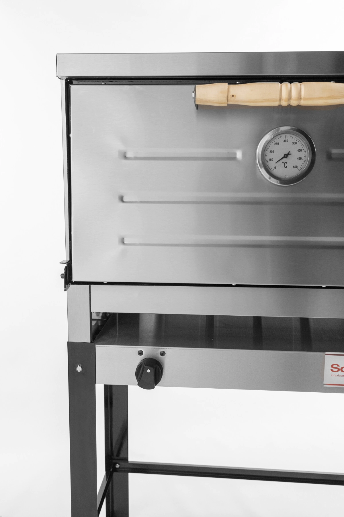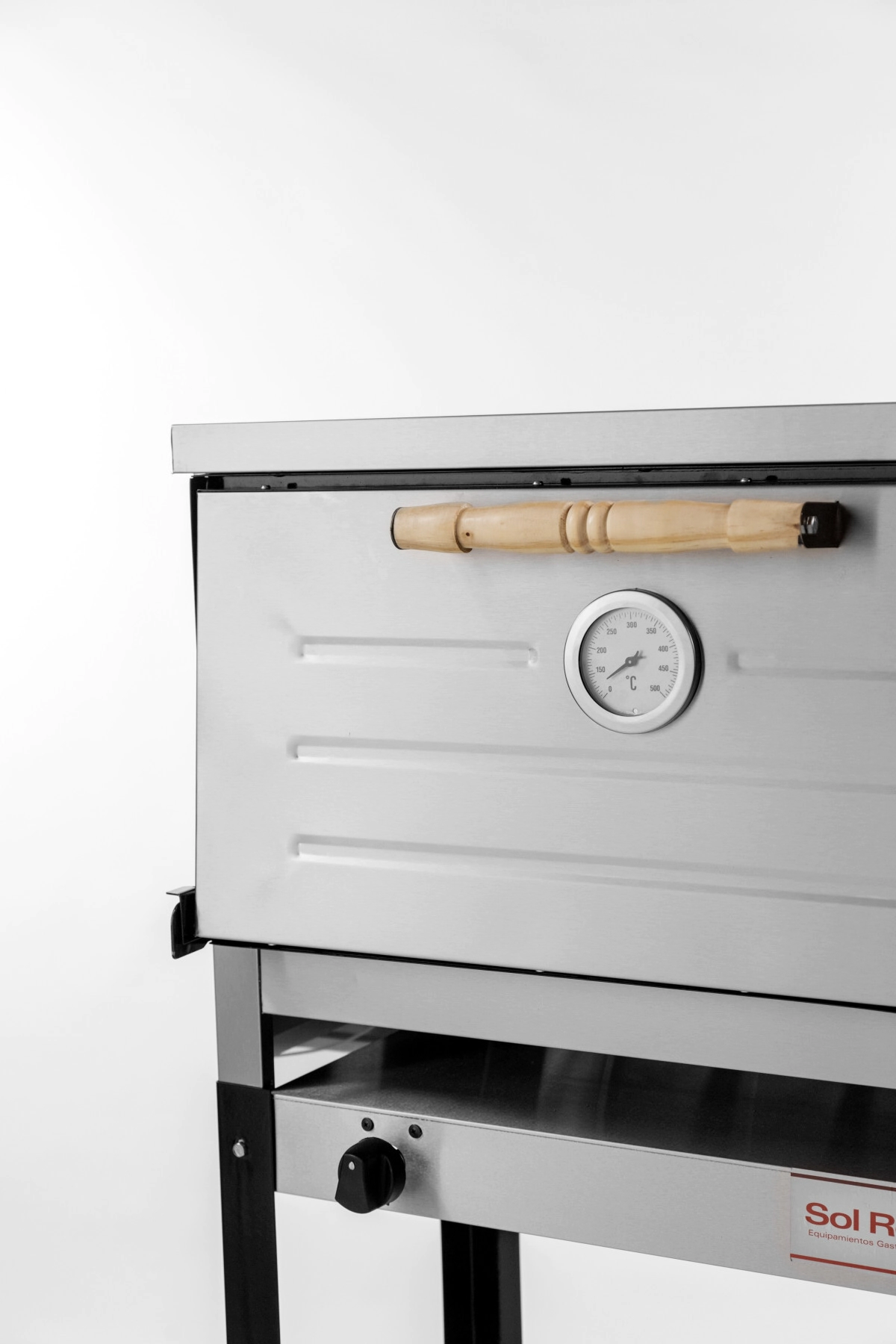 • Puerta desmontable con manija de madera, bisagras irrompibles y pirómetro analógico.