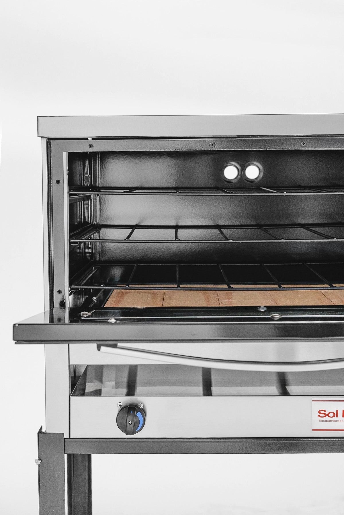 • Puerta de vidrio templado desmontable con manija metálica, bisagras irrompibles y pirómetro analógico.