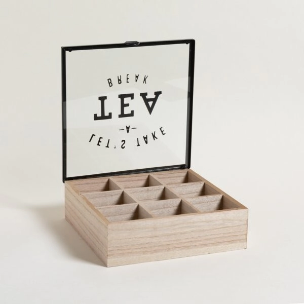 • Caja de té de madera con tapa de vidrio y marco metálico negro.