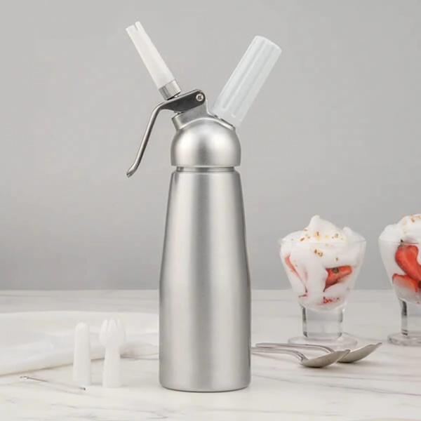 • Utiliza cápsulas de óxido nitroso (N2O) de 8g para airear la crema. Las cápsulas de N2O son económicas y fáciles de usar.