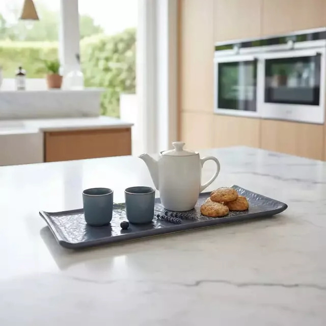 • Tiene una superficie texturizada, similar a la piedra, diseñada para una presentación de alimentos moderna y elegante