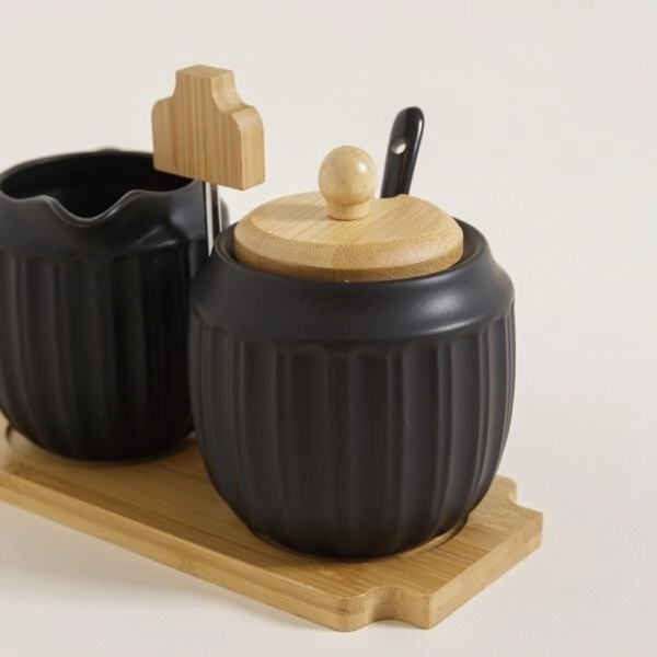 • Set de azucarera y lechera de porcelana negra brillante, con base de bamboo y cucharita de porcelana, de excelente calidad.