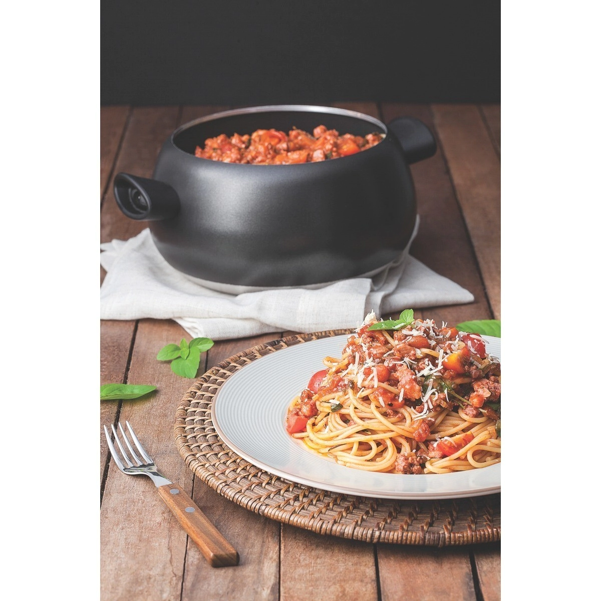 El juego Tramontina Pamplona de aluminio con revestimiento interno antiadherente Starflon T3, 3,8 l, 2 piezas es la elección ideal para que usted haga aquella comidita casera y llena de sabor, que invade la casa con un aroma sorprendente. Es una excelente opción para preparar sopas, caldos, risotos, salsas y la feijoada. Fabricada en aluminio con revestimiento interno y externo antiadherente Starflon T3 que tiene más poder de antiadherencia, más resistencia a la abrasión, más durabilidad, más facilidad de limpieza y es exento de PFOA, trae asas y pomo de baquelita antitérmica, evitando posibles quemaduras durante el uso. La tapa se fabrica con vidrio templado con borde de acero inoxidable y salida de vapor. Viene con cuchara para servir de silicona y eje de acero inoxidable, para traerle todavía más belleza a la mesa y hacer que el momento de servir sea todavía más práctico.