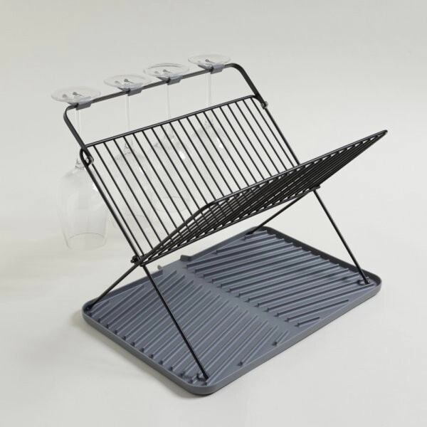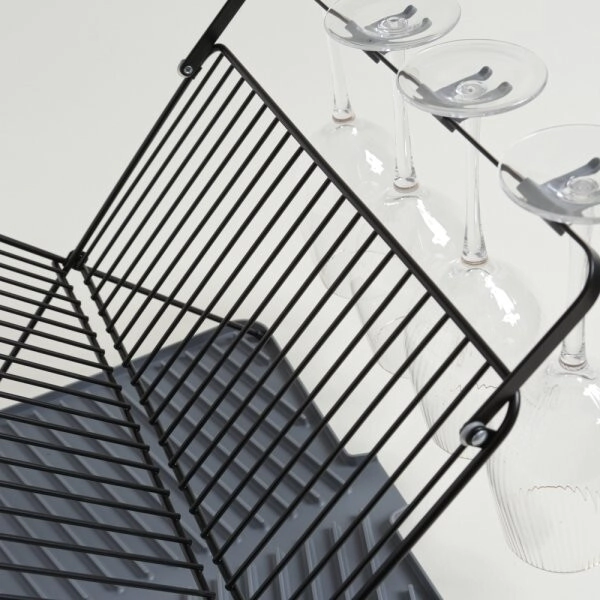 • Secaplatos negro de acero con bandeja de plástico gris. Trae accesorio para colocar copas.