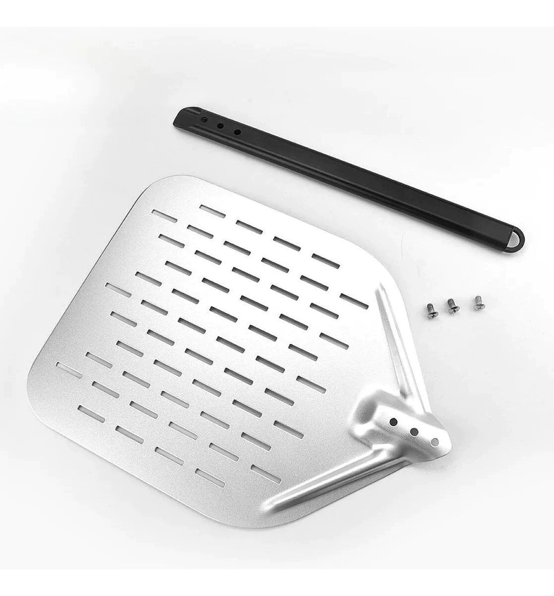 • Las perforaciones en la pala reducen el peso y permiten que el exceso de harina o sémola caiga, lo que ayuda a evitar que se queme en el horno y a lograr una base de pizza más limpia y crujiente
