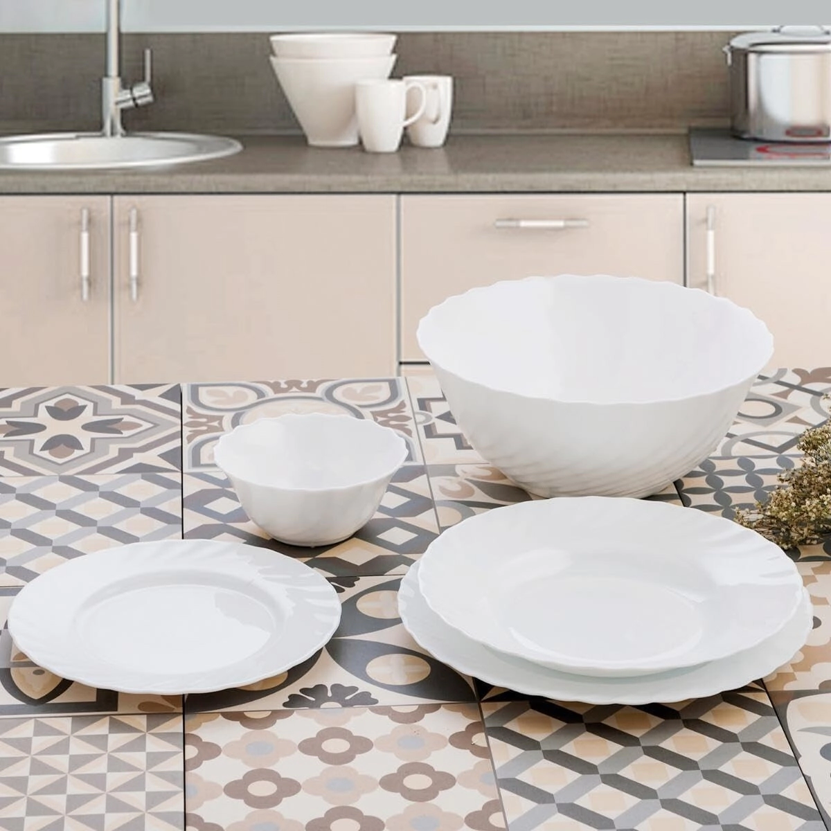 • El diseño se caracteriza por un borde festoneado y un patrón en espiral en la parte inferior del exterior.