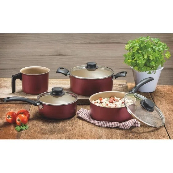 La Línea Turim siempre tien éxito en su cocina. Además de la practicidad de la cocción uniforme, proporcionada por el revestimiento interno y externo en antiadherente Starflon T1, permanecen más bonitas durante más tiempo. Son fáciles de limpiar porque, debido al antiadherente, los alimentos no se pegan. Se pueden usar en cocinas a gas, eléctricas o vitrocerámicas (resistencia eléctrica) y llevarse a lavavajillas. El juego contiene: 1 cacerola 2 asas 20 cm 2,8 L , 1 Olla c/ mango 16 cm 1,4 L ,1 Olla c/ mango 18cm 2,0 L , 1 Jarro hervidor 12 cm 1 L. Tapas de vidrio templado.