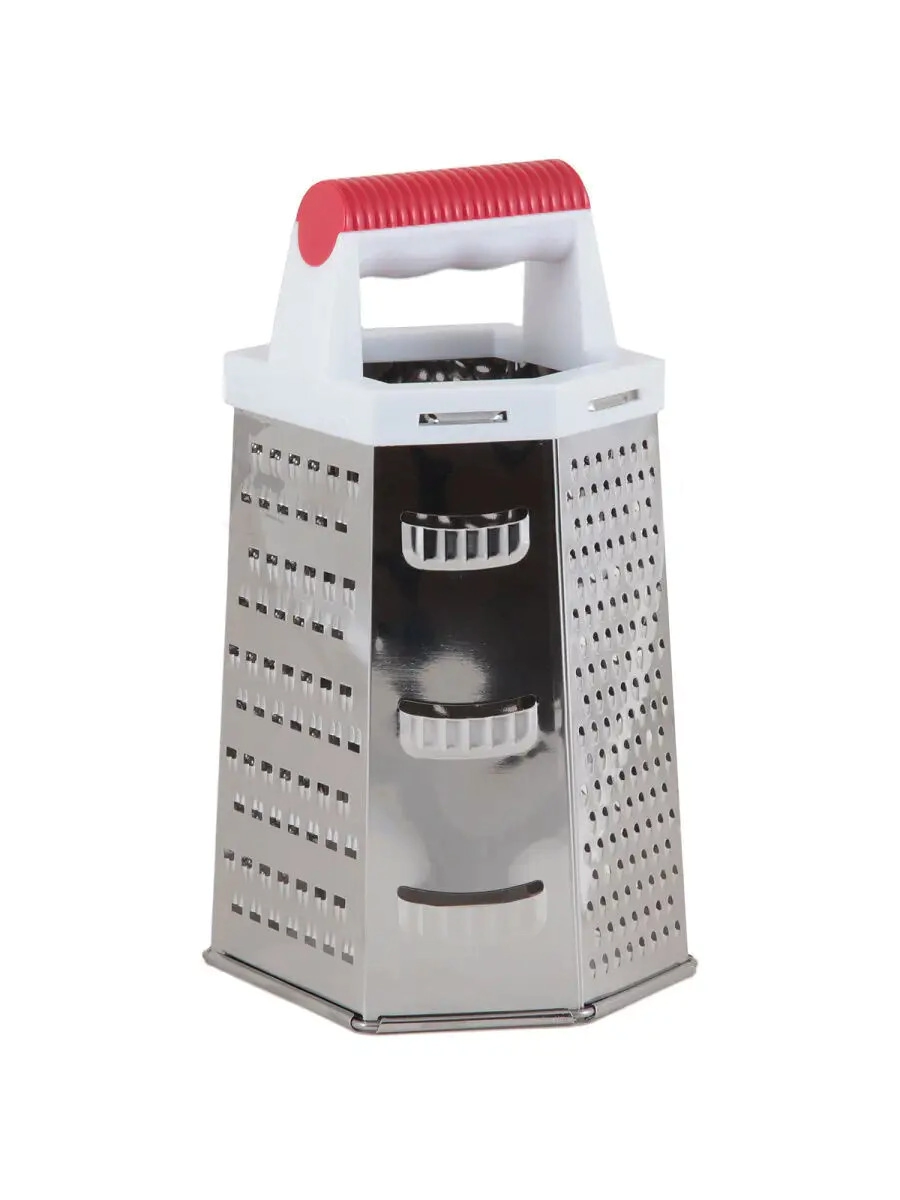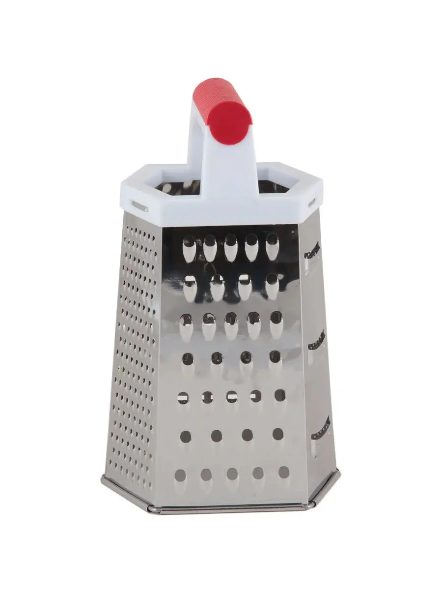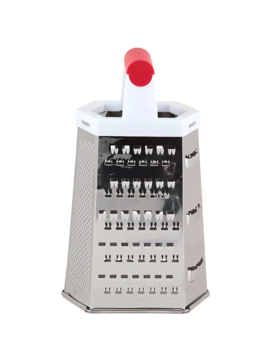• Es un rallador de seis caras, un utensilio de cocina que se utiliza para desmenuzar alimentos sólidos como queso, verduras, frutas y pan duro