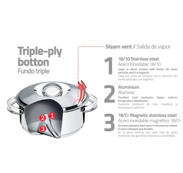 El fondo triple distribuye el calor uniformemente, sin necesidad de usar fuego alto. Además, eso genera ahorro de energía.