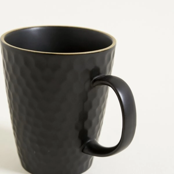 • Mug color negro mate. Su trama simula un panal de abejas y tiene una terminación de borde color beige.